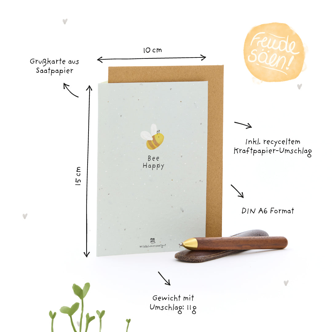 🐝 Bee happy – das Leben darf leicht sein: Diese Karte ist ein liebevoller Gruß für mehr Lächeln im Alltag. Sie erinnert auf charmante Weise daran, die kleinen Dinge zu feiern, den Moment zu genießen – und das Leben nicht zu schwer zu nehmen. Ideal als fröhliche Überraschung für liebe Menschen oder einfach, um mal wieder „Don’t worry – be(e) happy“ zu sagen.