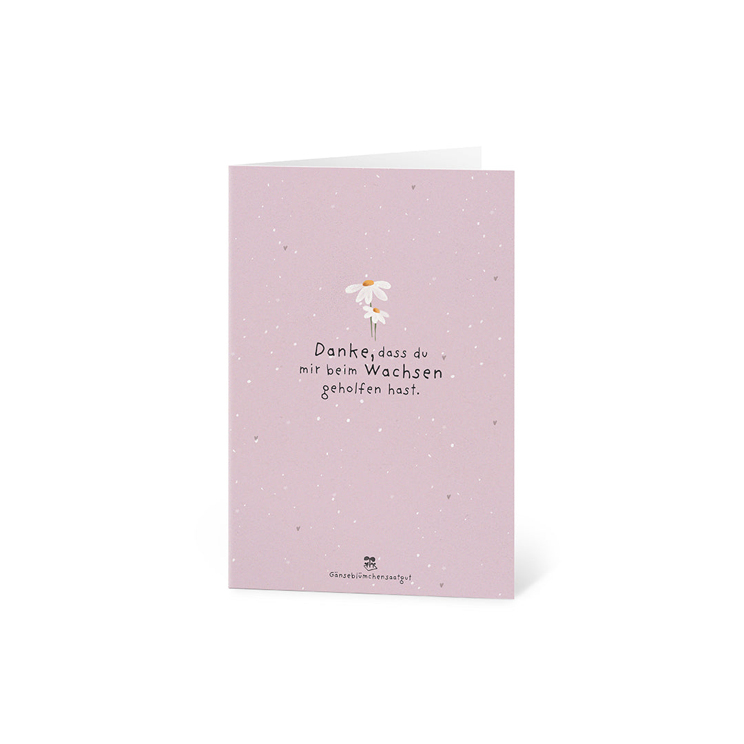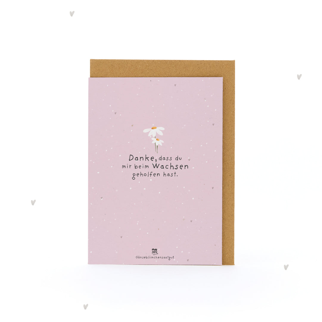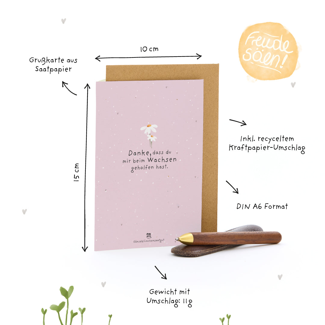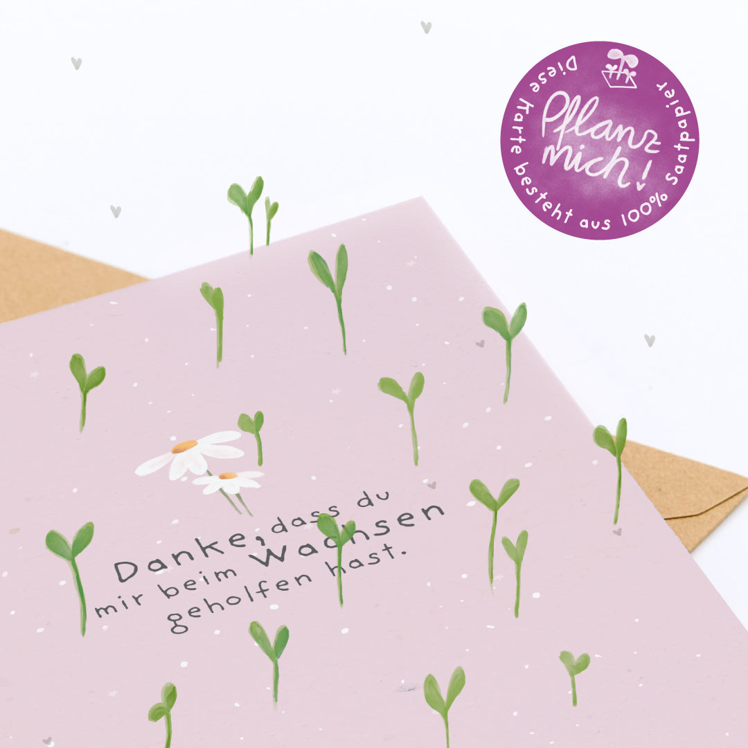 Ein Dankeschön, das aufblüht: Es gibt Menschen, die uns wachsen lassen - mit Zeit, Geduld, einem offenen Ohr und ganz viel Herz. Diese Karte sagt auf blumige Weise: Du hast mich begleitet, gestärkt und geprägt. Und dafür danke ich dir - von Herzen und für immer. Gänseblümchen als Zeichen der Wertschätzung: Aus dem Saatpapier sprießen schon bald zarte Gänseblümchen - als lebendiger Gruß, der die Bedeutung deiner Worte unterstreicht. Ein kleines Blümchen mit großer Aussage: Danke, dass du da warst, als es gezählt hat. Einfach einpflanzen: Die Karte kann im Ganzen oder in Stücke gerissen eingepflanzt werden. Mit etwas Erde, Wasser und Sonne wächst daraus ein blühendes Zeichen der Dankbarkeit - liebevoll, nachhaltig und ganz besonders. Nachhaltig & plastikfrei: Die Karte ist aus kompostierbarem Saatpapier gefertigt, der Umschlag besteht aus recyceltem Kraftpapier, die Schutzhülle ist biologisch abbaubar - ein grüner Gruß, der Herzen berührt und die Umwelt schont.