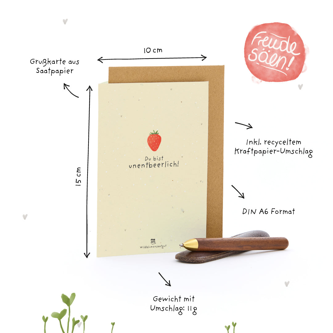 Du bist unentbeerlich: Diese Karte ist für Menschen, die man nicht mehr missen möchte - im Freundeskreis, im Team oder im Herzen. Sie sagt: Du bist wichtig. Du bist ein Teil meines Lebens. Und es ist richtig schön, dass es dich gibt. Wertschätzung, die aufblüht: Aus dem Saatpapier mit Wildblumensamen sprießen schon bald Klatschmohn, Gänseblümchen und Vergissmeinnicht - als blühendes Dankeschön für jemanden, der Spuren hinterlässt. Einfach einpflanzen: Die Karte kann im Ganzen oder in Stücke gerissen eingepflanzt werden. Mit etwas Erde, Wasser und Sonne entsteht ein kleines Blütenmeer - als Zeichen, dass gute Beziehungen wachsen und bleiben dürfen. Nachhaltig & plastikfrei: Die Karte besteht aus kompostierbarem Saatpapier, der Umschlag aus Kraftpapier, die Hülle ist biologisch abbaubar - ein besonderer Gruß mit Herz und Wirkung.