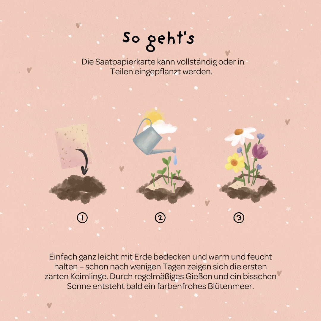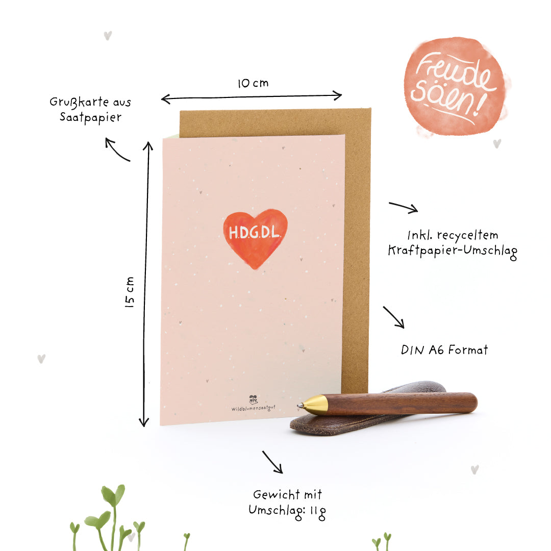 HDGDL - fünf Buchstaben, die von Herzen kommen: Diese Karte ist eine liebevolle Botschaft an die beste Freundin, den Herzensmenschen oder jemanden, der einfach wichtig ist. Ein ehrliches "Ich hab dich ganz doll lieb" - direkt, persönlich und schön wie echte Freundschaft. Gefühle, die weiterblühen: Aus dem Saatpapier mit Wildblumensamen sprießen schon bald Klatschmohn, Gänseblümchen und Vergissmeinnicht - als lebendiges Zeichen einer Freundschaft, die wächst, bleibt und mit jedem Tag mehr aufblüht. Einfach einpflanzen: Die Karte kann im Ganzen oder in Stücke gerissen eingepflanzt werden. Mit etwas Erde und Wasser entsteht ein buntes Blütenmeer - eine schöne Erinnerung an das, was euch verbindet. Nachhaltig & plastikfrei: Die Karte ist aus kompostierbarem Saatpapier gefertigt, der Umschlag besteht aus Kraftpapier, die Hülle ist biologisch abbaubar - ein lieber Gruß mit Herz und Haltung.