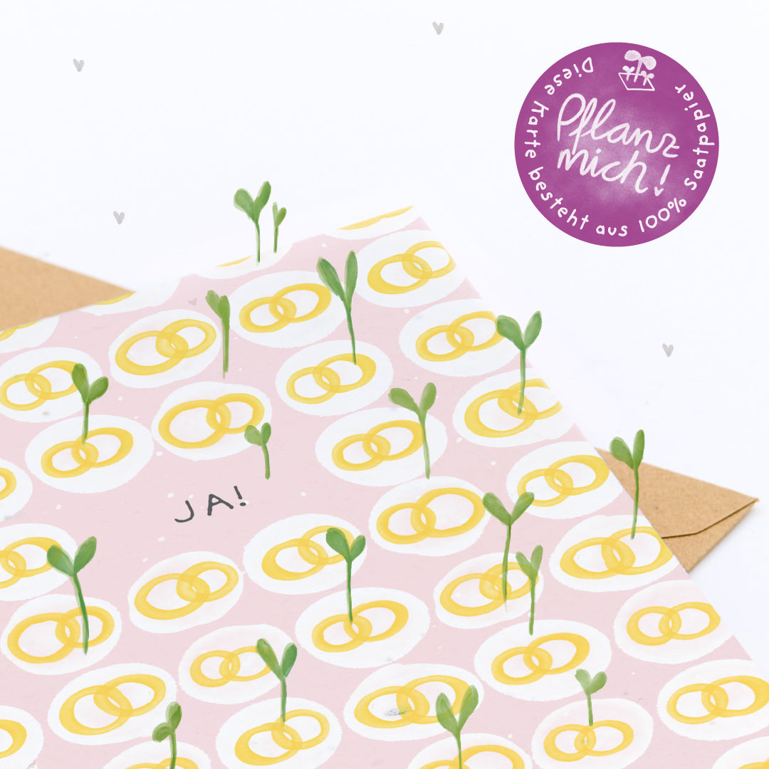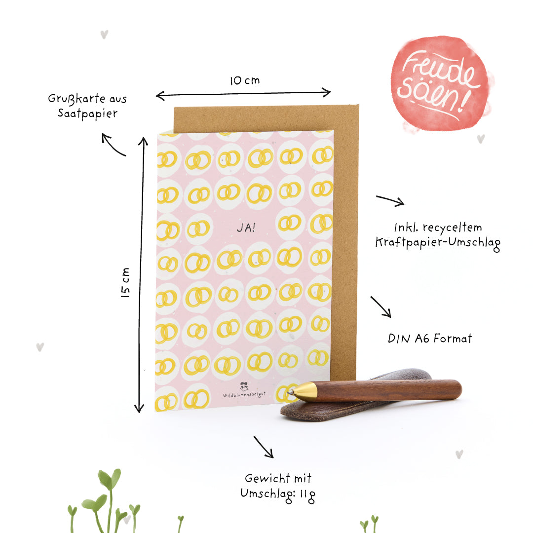 Ein kleines "Ja" mit großer Bedeutung: Diese Karte begleitet einen der schönsten Augenblicke im Leben - den Moment, in dem zwei Menschen einander das Herz schenken. Ob standesamtliche oder kirchliche Hochzeit oder freie Trauung - sie sagt auf liebevolle Weise: Eure Liebe ist etwas ganz Besonderes. Und möge sie wachsen, blühen und nie aufhören, euch glücklich zu machen. Liebe, die Wurzeln schlägt: Aus dem Saatpapier mit Wildblumensamen sprießen schon bald Klatschmohn, Gänseblümchen und Vergissmeinnicht - als lebendiges Symbol für eine Liebe, die wächst, blüht und mit der Zeit immer stärker wird. Einfach einpflanzen: Die Karte kann im Ganzen oder in Stücke gerissen eingepflanzt werden. Leicht mit Erde bedecken & feucht halten - schon bald zeigt sich ein buntes Blütenmeer, das die Liebe des Hochzeitspaares im wahrsten Sinne des Wortes aufblühen lässt. Nachhaltig & plastikfrei: Die Karte besteht aus kompostierbarem Saatpapier, der Umschlag aus Kraftpapier, die Hülle ist biologisch abbaubar - ein Hochzeitsgruß, der Freude macht und die Liebe weiter wachsen lässt.