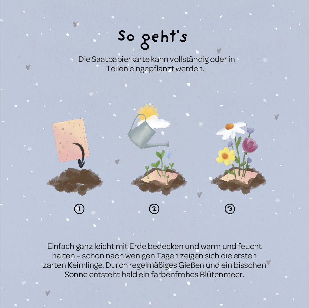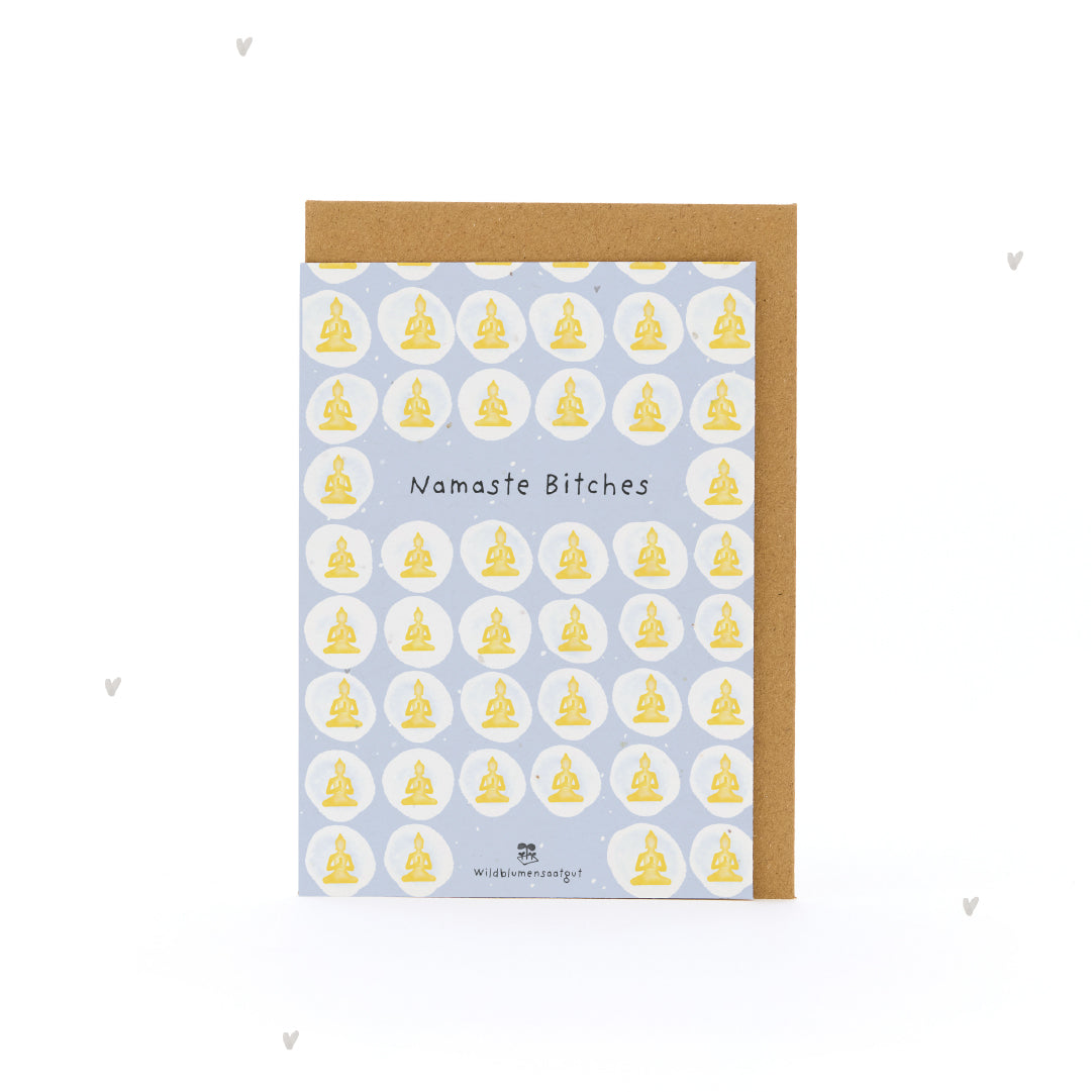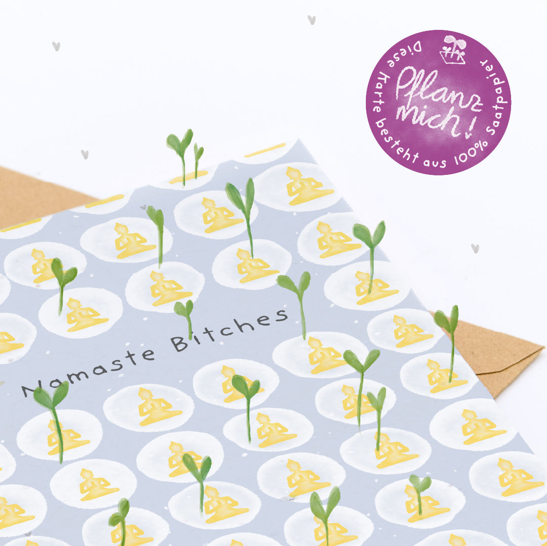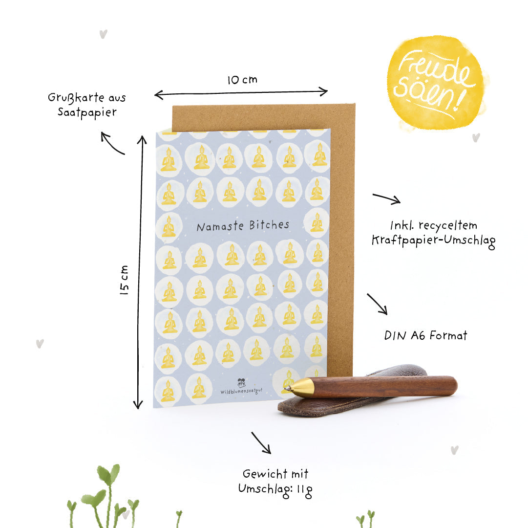 Namaste - mit einem Augenzwinkern: Diese Karte ist eine liebevolle Verbeugung vor deiner Bestie, Yoga-Freundin oder einem Herzensmenschen - perfekt zum Geburtstag, fürs Yoga-Retreat, den Mädelsabend oder einfach so. "Namaste Bitches" sagt auf spielerische Weise: Ich schätze dich. Und du bringst Licht, Liebe und eine ordentliche Portion Spaß in mein Leben. Eine Botschaft, die Wurzeln schlägt: Aus dem Saatpapier mit Wildblumensamen sprießen schon bald Klatschmohn, Gänseblümchen und Vergissmeinnicht - als bunte Erinnerung an eure Verbundenheit, die weiterwächst. Eine kleine Geste mit großem Herzen, die nicht nur im Kopf, sondern auch im Blumentopf bleibt. Einfach einpflanzen: Die Karte kann im Ganzen oder in Stücke gerissen eingepflanzt werden. Leicht mit Erde bedecken & feucht halten - schon bald zeigt sich ein buntes Blütenmeer, das eure Freundschaft wortwörtlich zum blühen bringt. Nachhaltig & plastikfrei: Die Karte besteht vollständig aus Saatpapier, der Umschlag aus robustem Kraftpapier und die Schutzhülle aus biologisch abbaubarem Kunststoff. Ein Geschenk, das nicht nur Freude macht, sondern auch die Welt ein bisschen grüner.